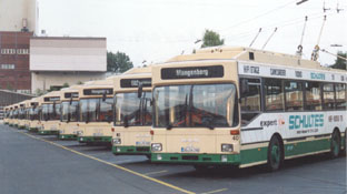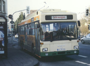 | Obus 54 wartet an der Kreuzung Schlagbaum auf die Weiterfahrt nach Widdert. Er kommt von der Hasselstraße. | Wagen 37 erreicht 2001 die