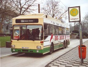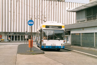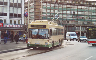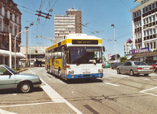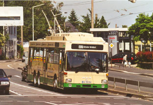 | Obus 40 an der verlegten Haltestelle "Hbf." | Obus 43 zeigt sich ohne MAN-Frontbinde. | |