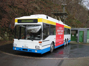 | Obus 35 wartet am Graf-Wilhelm-Platz hinter der ehemaligen Verkehrsaufsicht auf die Weiterfahrt nah Vohwinkel als Linie 683. | Obus 64 mit neuer