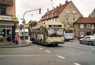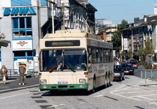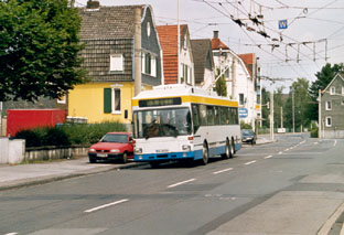| An der Schleife Krahenhöhe treffen sich im August 2002 die Wagen 34 und 36. | Richtung Aufderhöhe war Obus 44 am 25.07.02 unterwegs (Mangenberger Straße). | |