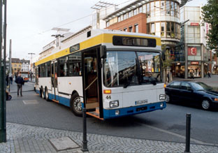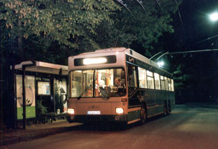 Wagen 44 blieb am 04.10.02 mit einem geplatzten rechten Hinterrad am Mühlenplatz liegen (siehe Schräglage des Obus). | |